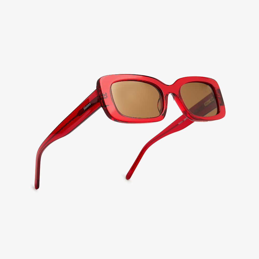 Su forma amplia y marcada aporta presencia, mientras que la montura en tono rojo y las lentes cálidas refuerzan ese ambiente de transición propio del atardecer.